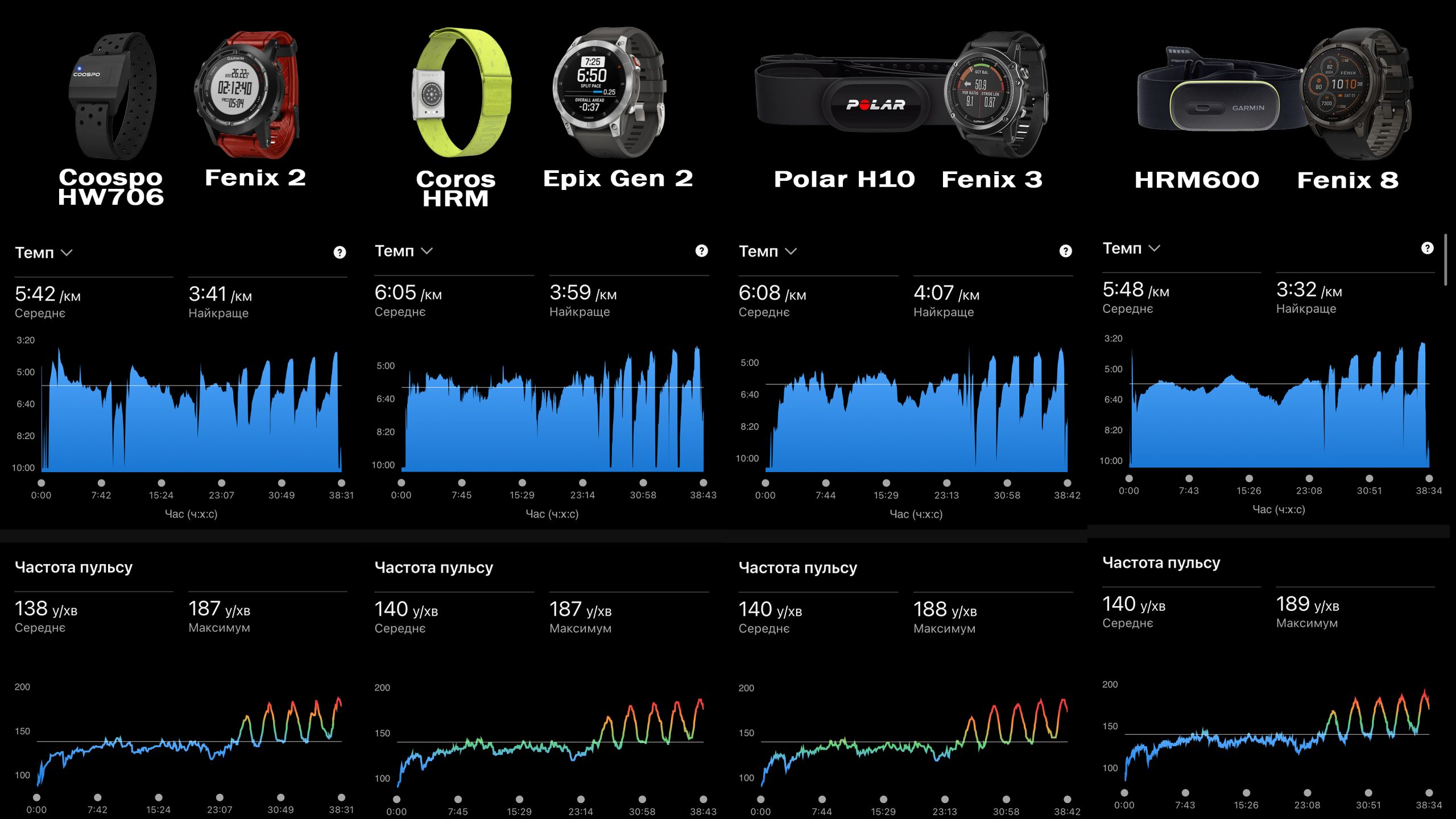 Щоб остаточно визначити, хто точніший, треба провести ще кілька тестів — на низькому, середньому та високому пульсі. Але вже зараз видно, що Coros і Garmin HRM600 поводяться стабільно, а Coospo підводить саме на інтервалах.